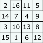 縦4マス、横4マス、合計16マスの中に1から16までの数字を1回使用して升を埋めて、縦、横、斜めそれぞれの合計が等しくなる表を言います。